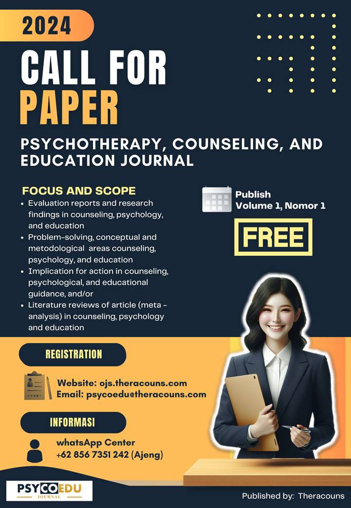Psychotherapy, Counseling, and Education Journal is a peer-reviewed open-access journal that publishes research articles in psychotherapy, counseling, and education. Every submitted manuscript will be reviewed by at least two peer-reviewers using the double-blind review method.